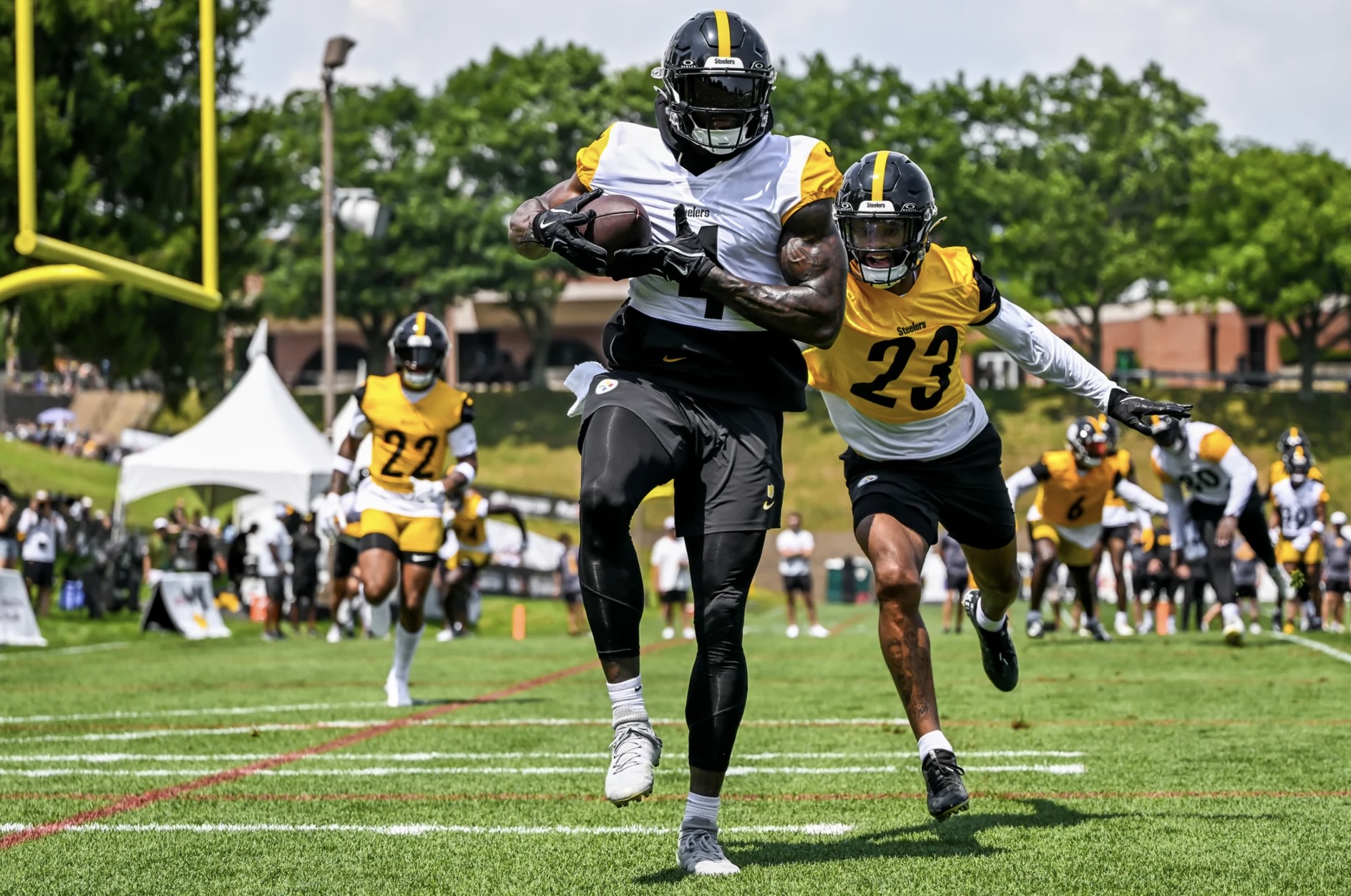This second practice of the Steelers' training camp Friday here at Saint Vincent College saw all 41 of Rodgers' years and all 21 of his NFL seasons wholly disregarded on a single seven-shots drill in which he deftly delivered short-range touchdown passes to DK Metcalf and Pat Freiermuth, the first of those having been probably the prettiest placement I've seen on Chuck Noll Field in half a decade. And a little later, on a drill from the theoretical Pittsburgh 40, Rodgers found Calvin Austin breaking free down the right sideline off a double move with just the right touch.
