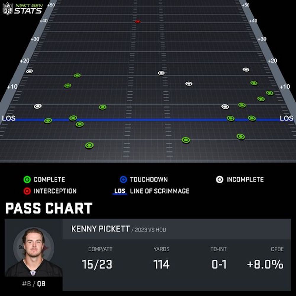 ... Pickett regressed here, after a mildly encouraging showing in Las Vegas, to the bad decisions, the bad vision, the bad aim that'd marked his first two games. In this one, he was 15 of 23 for 114 yards, nothing close to a touchdown and this early pick: