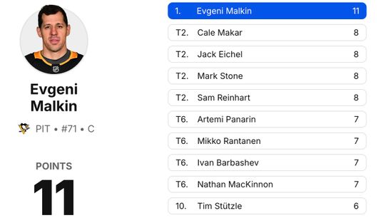 Geno and Sid, the former with a goal and three assists here, the latter with a goal and two assists, are both in the technical top 10, with Geno leaping into the lead and Sid now one of a dozen players tied for 10th. Geno's 38, Sid's 37, and they're point-a-gamers at their base, still truly special at their peak.