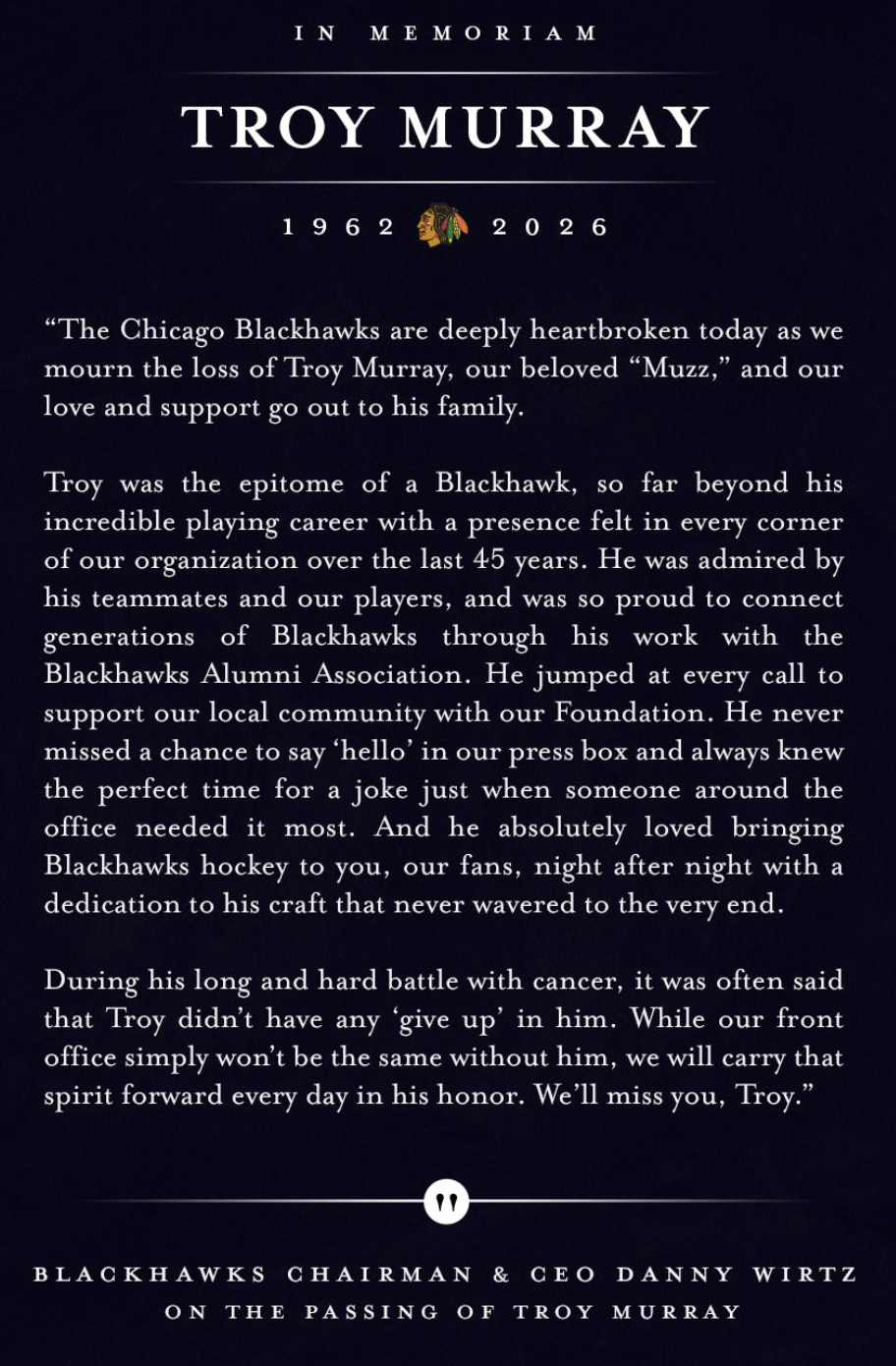 Mr. Murray worked as a radio and television broadcast analyst for the Blackhawks for 27 years, through the 2024-25 season.
