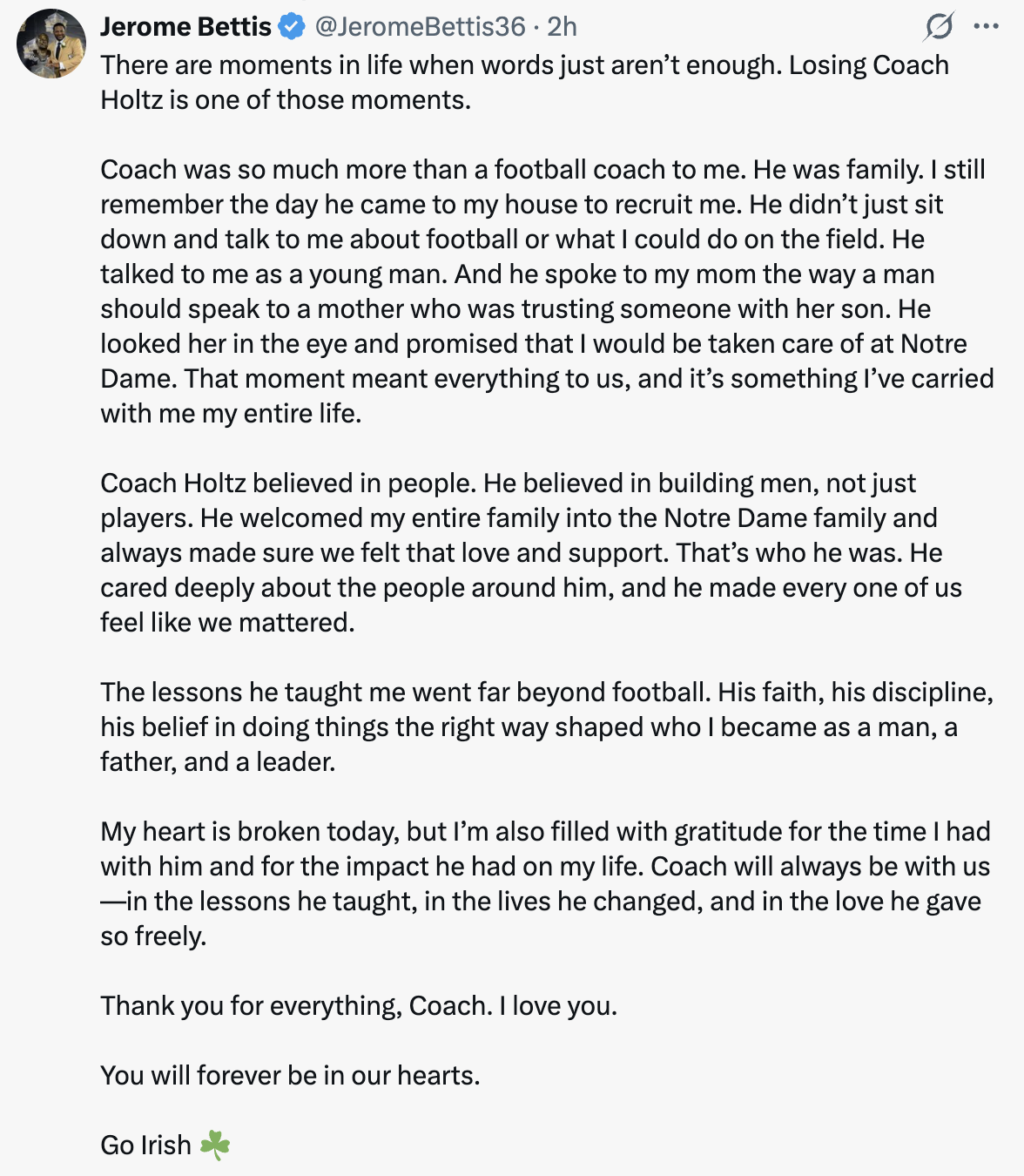 Jerome Bettis took to social media to pay tribute to Lou Holtz, his former Notre Dame head coach, who died Wednesday at age 89: