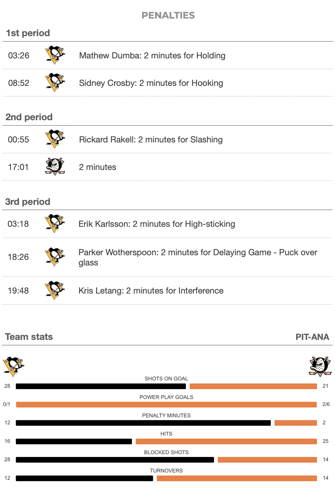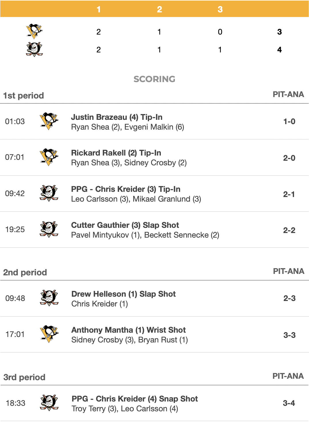 Everything everyone could want on the Penguins' 4-3 loss to the Ducks at Honda Center, beginning with all that I have from here: