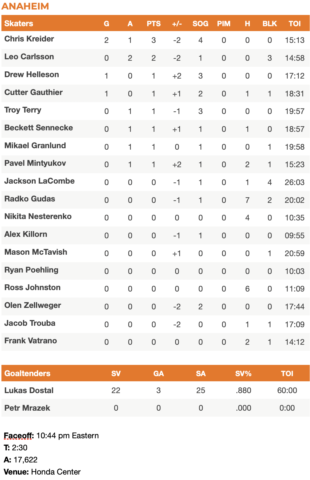1. Chris Kreider, Ducks LW2. Cutter Gauthier, Ducks LW3. Drew Helleson, Ducks D