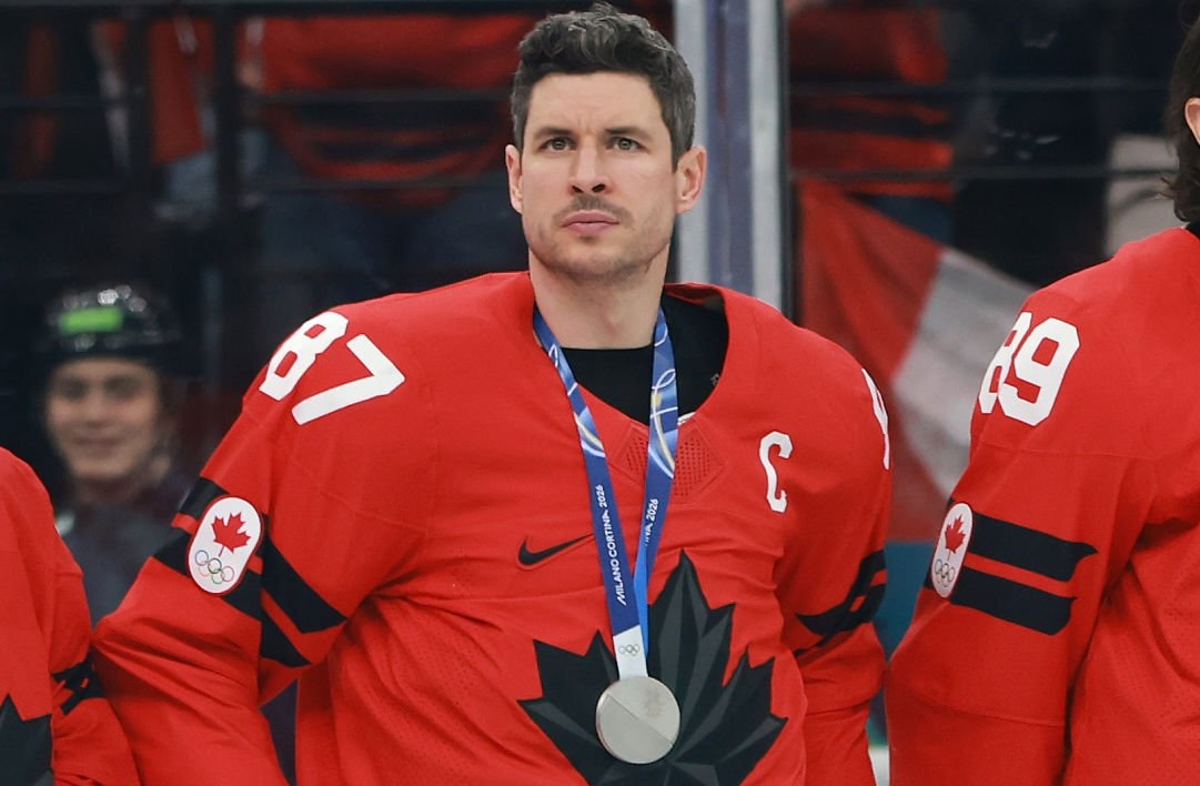 Sidney Crosby joined teammates on the ice for the medal ceremony. Doesn't look too happy: