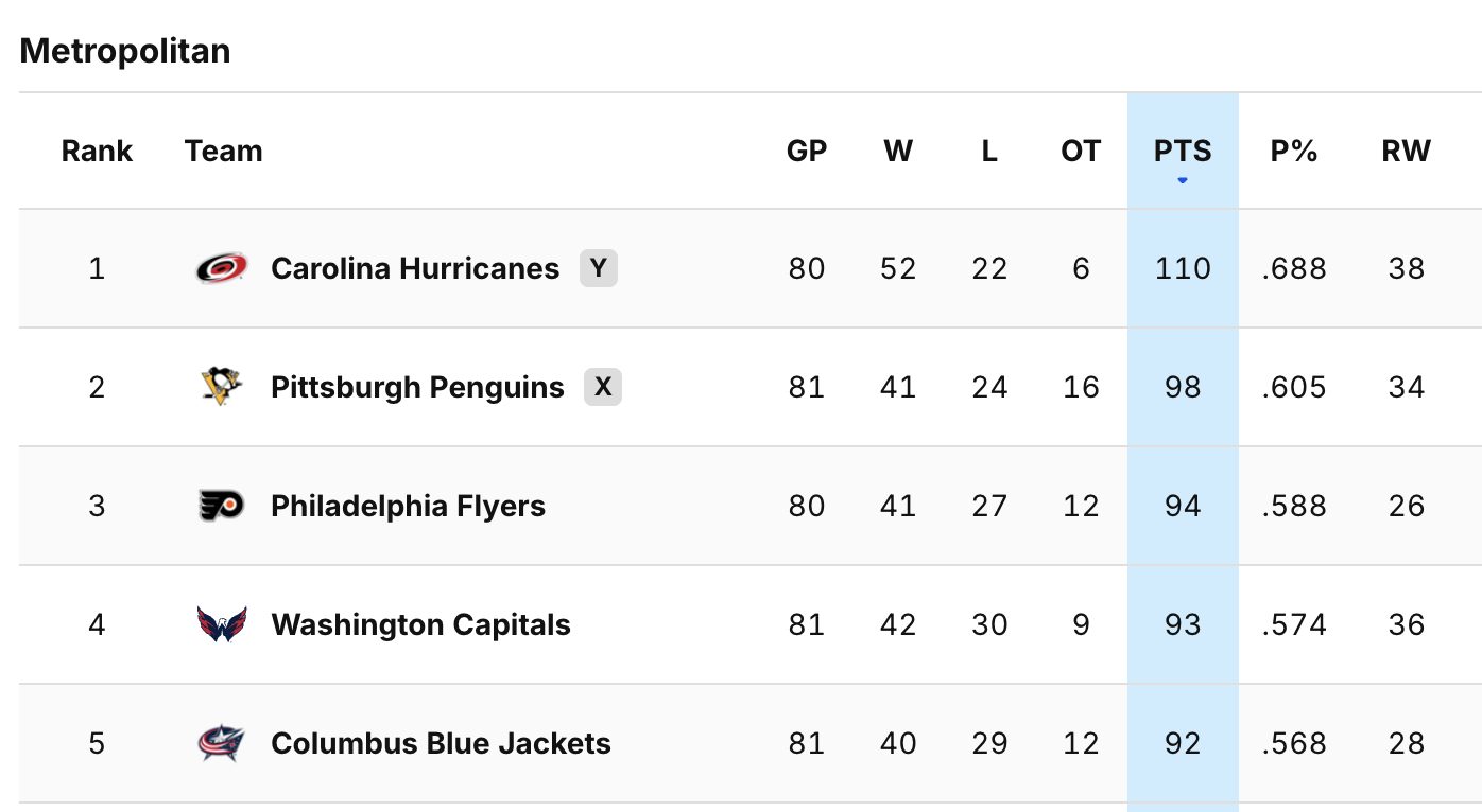 • If the Flyers win either of their remaining games in any fashion, or lose both games in OT/shootout, they clinch the third seed and eliminate the Capitals and Blue Jackets.