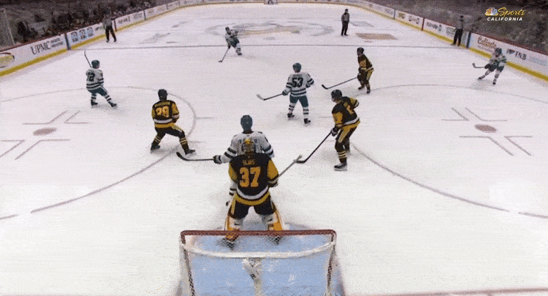 Over that last 14:35 of regulation, the Penguins were outshot 16-4. The Sharks started to get real momentum after Erik Karlsson took a penalty for playing with a broken stick, and Klingberg scored on the ensuing power play, cutting the Penguins' lead to 5-2: