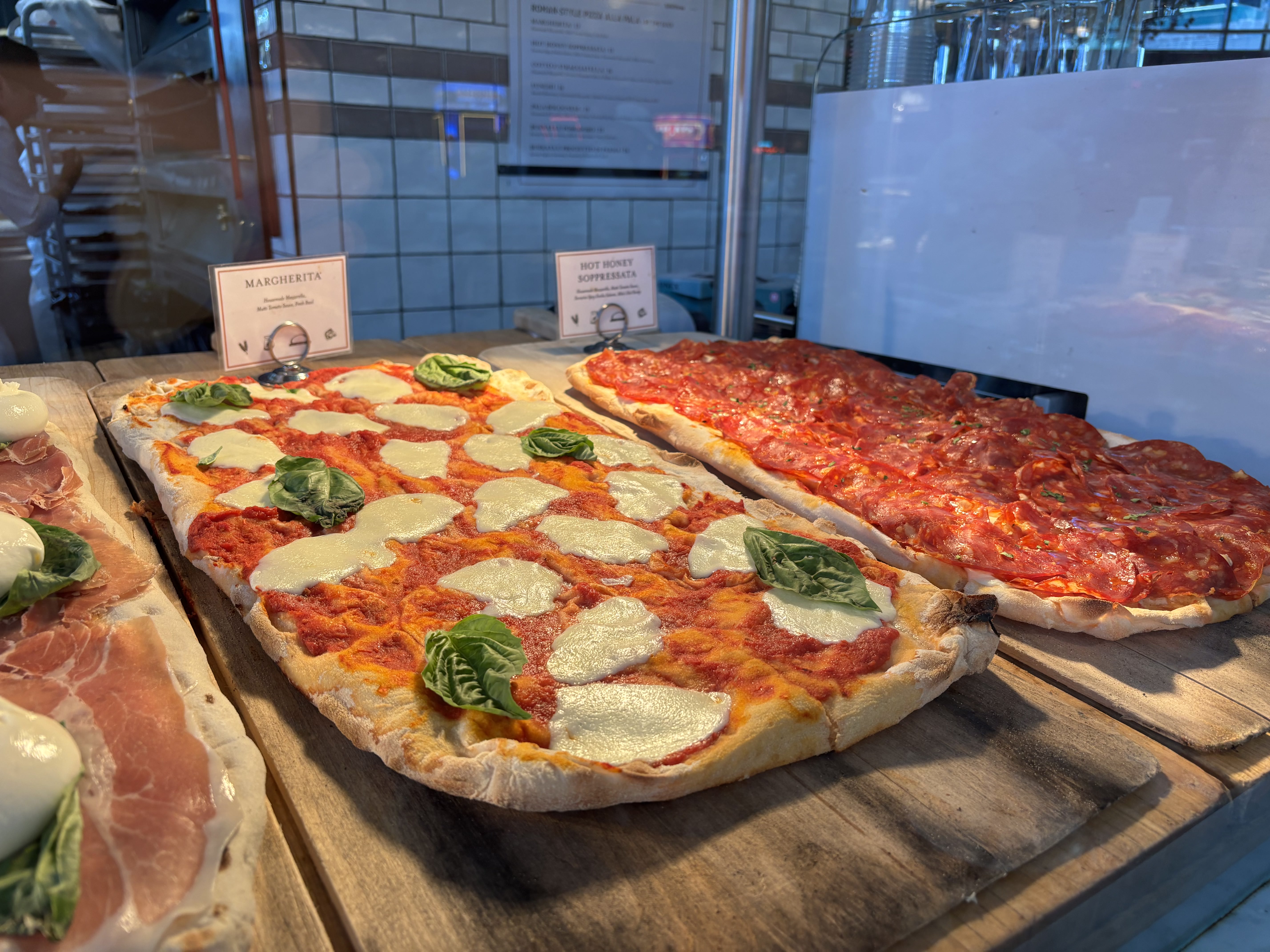 If you've never been, it's an Italian food hall with stalls for groceries, too. There are locations in a few major cities, but the one here is the biggest -- there are stalls for sandwiches, pasta, seafood, cheese, meats, pizza. On the lower level there are a couple more that are more like cafes, plus a gelato stand. I opted for the pizza this time: