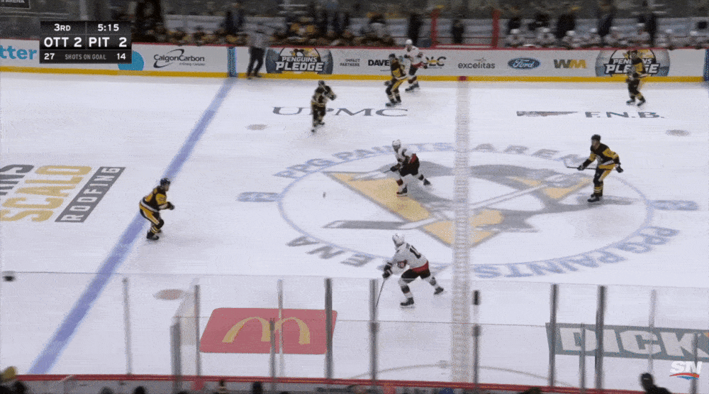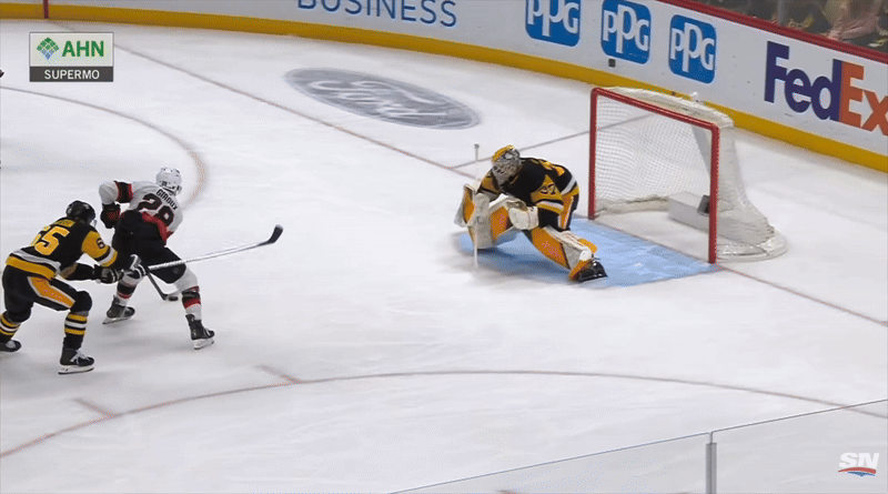 Giroux crossed the Pittsburgh blue line with speed and without anyone in front of him thanks to Tim Stutzle batting the puck out of the air into the zone. Erik Karlsson fought hard from behind, giving Giroux a couple hard whacks to his right leg. Giroux then tripped and fell into both Arturs Silovs and the post, knocking the net off the moorings while the puck wound up crossing the goal line: