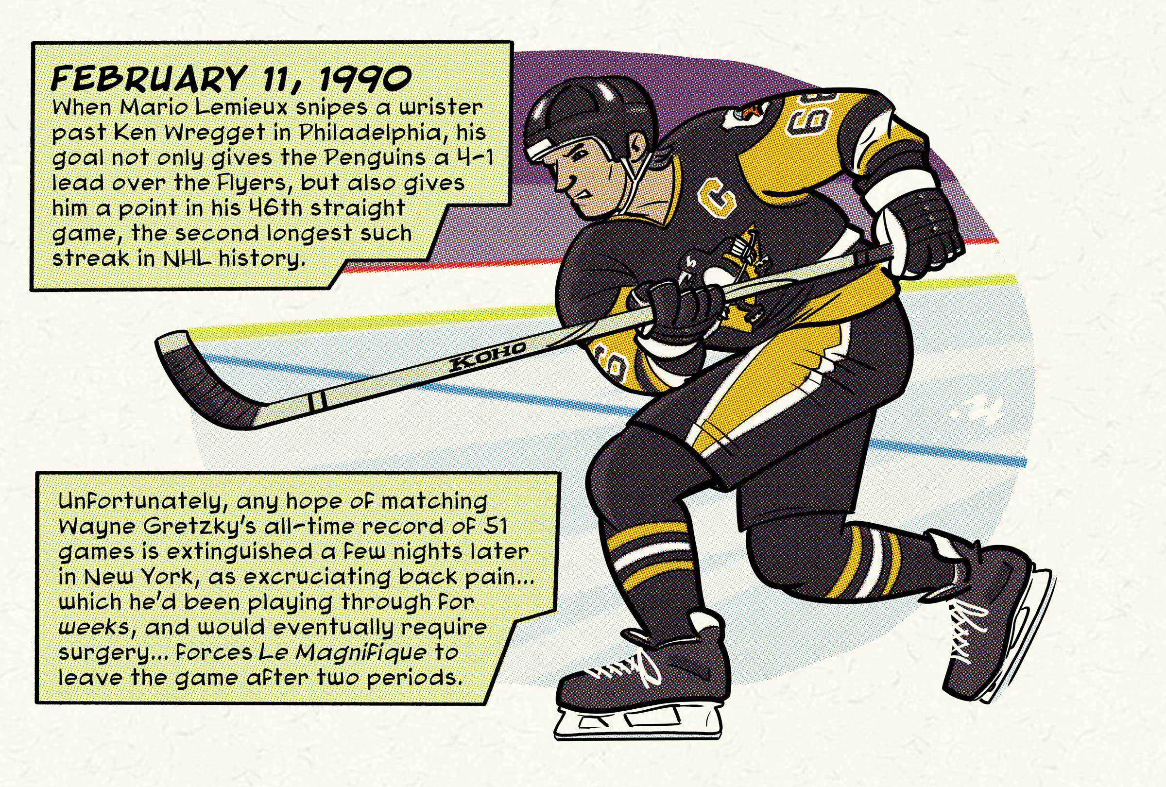 Mario Lemieux scored in an all-time second-best 46 straight games before back problems forced him out of a 47th. As is often the case when one talks about the greatest player ever, just imagine what a fully healthy Le Magnifique might have accomplished!