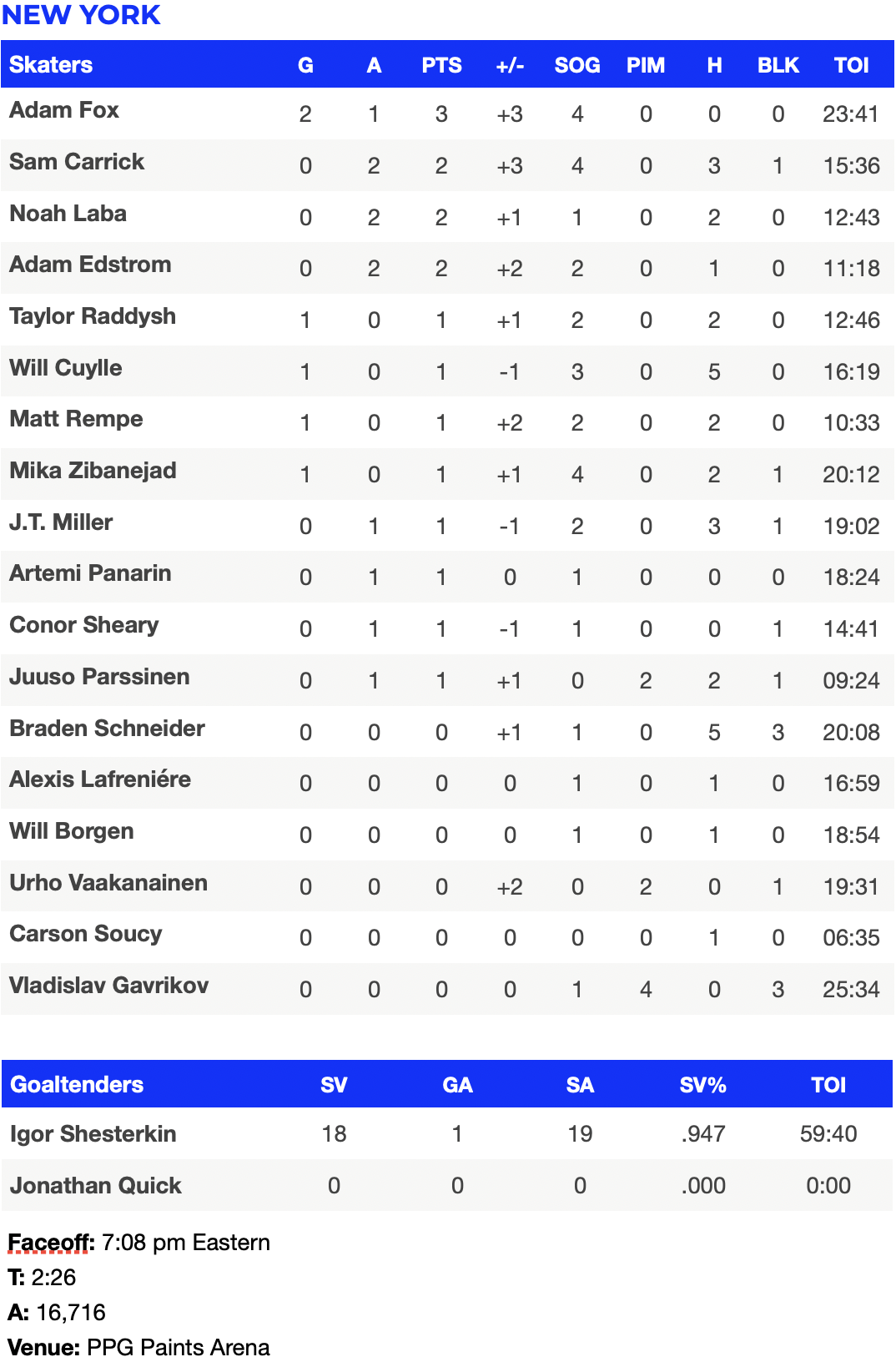 1. Adam Fox, Rangers D2. Adam Edstrom, Rangers C3. Ben Kindel, Penguins C