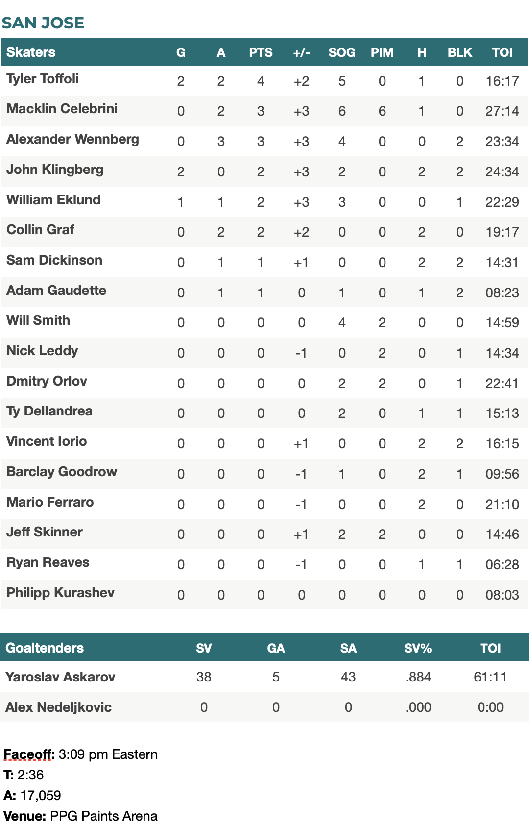 1. John Klingberg, Sharks D2. Tyler Toffoli, Sharks RW3. Anthony Mantha, Penguins RW