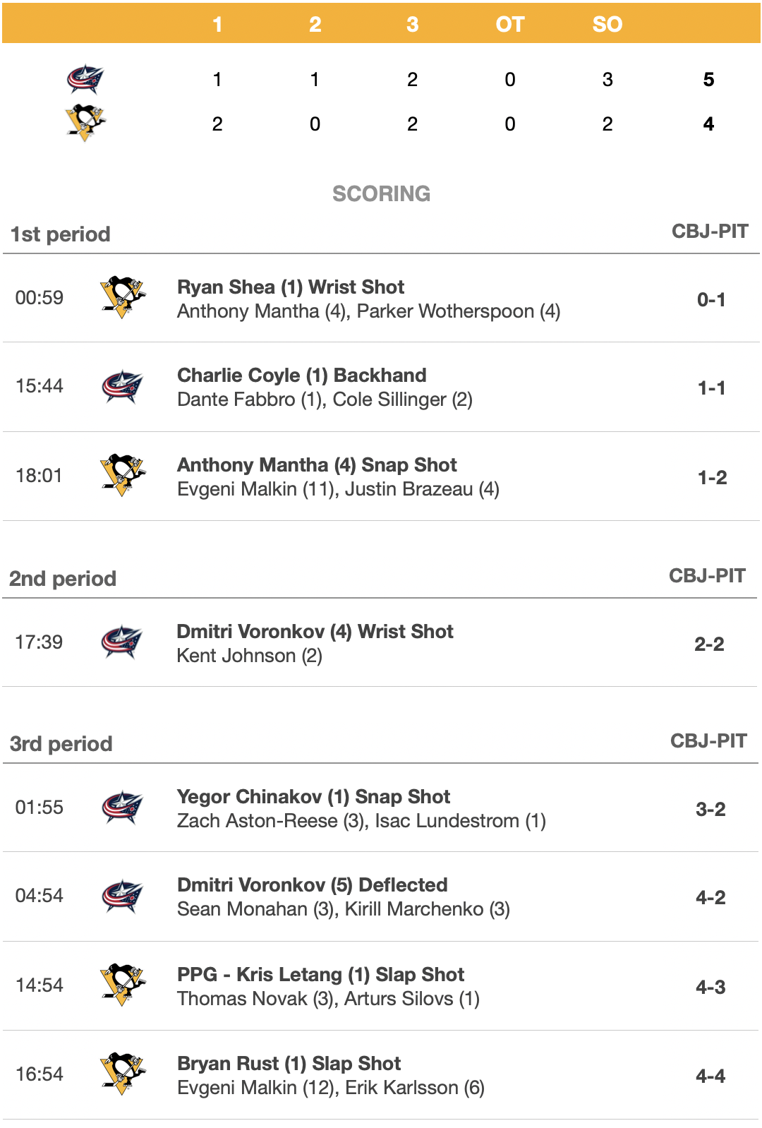 Everything everyone could want on the Penguins' 5-4 shootout loss to the Blue Jackets tonight at PPG Paints Arena, beginning with all that Jose Negron, Eric Bowser and I have from here: