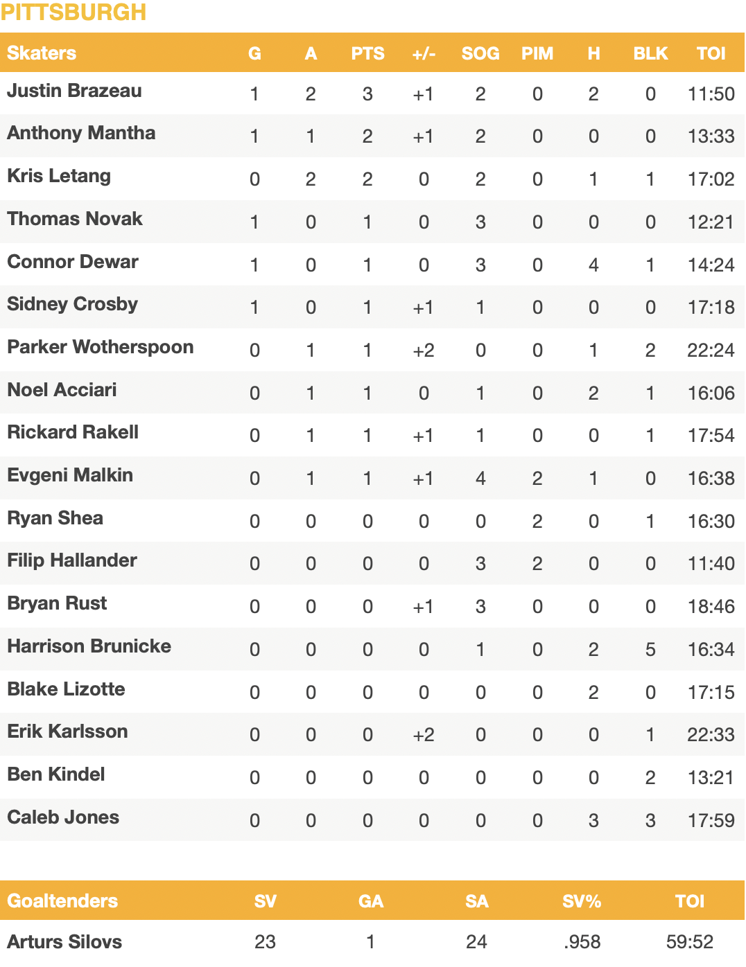 1. Justin Brazeau, Penguins RW2. Sidney Crosby, Penguins C3. Kris Letang, Penguins D