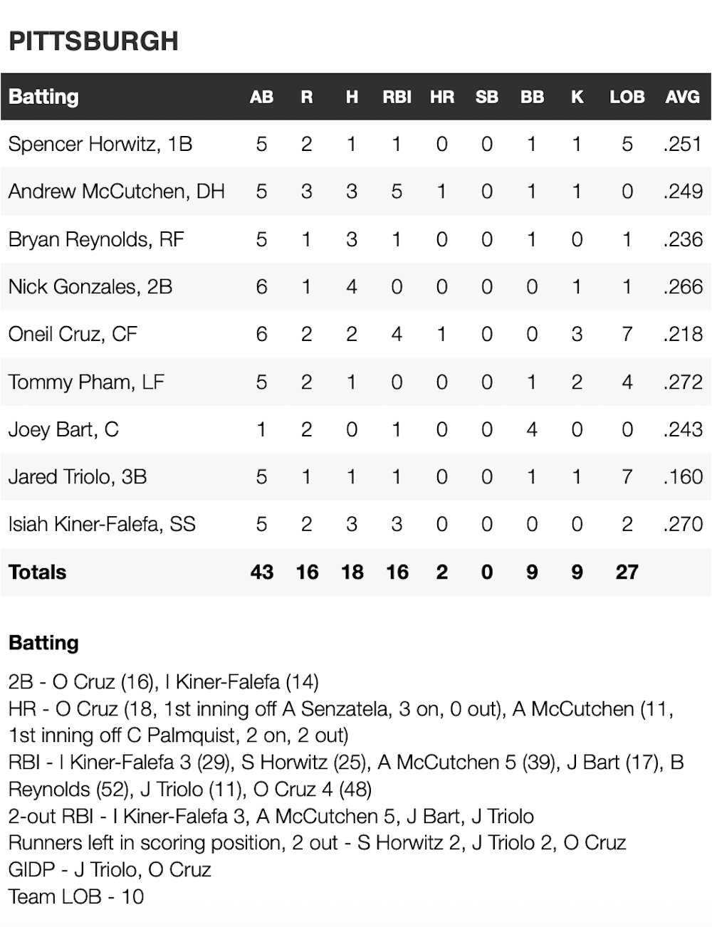 Everyone in the Pirates' lineup had at least one hit, aside from Joey Bart, who reached base five times and finished with four walks, becoming the first Pirates catcher since Ryan Doumit in 2007 to accomplish the latter feat. Nick Gonzales finished with four of the Pirates' 18 hits. Andrew McCutchen had three hits and drove in five runs, while Bryan Reynolds and Isiah Kiner-Falefa also contributed with three-hit efforts. Oneil Cruz had two hits, including a first-inning grand slam.
