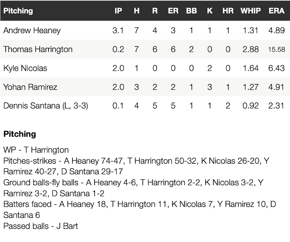 Major League Baseball's worst team scored five runs off DennisSantana in the ninth inning, capped by two on a walk-off home run by BrentonDoyle, and seven runs over the final two innings. They became the first team in history to allow 15-plus runs, allow a nine-run inning and face a nine-run deficit and still win the same game. AndrewHeaney allowed four runs (three earned) over 3 1/3 innings before ThomasHarrington allowed six runs on seven hits in 2/3 of an inning, YohanRamirez two runs in two innings.