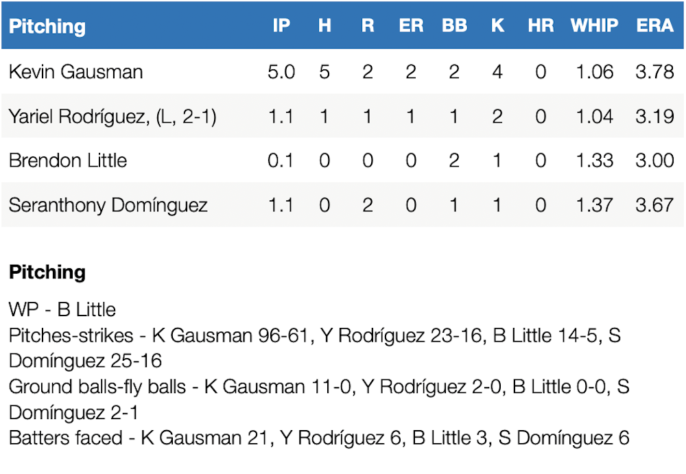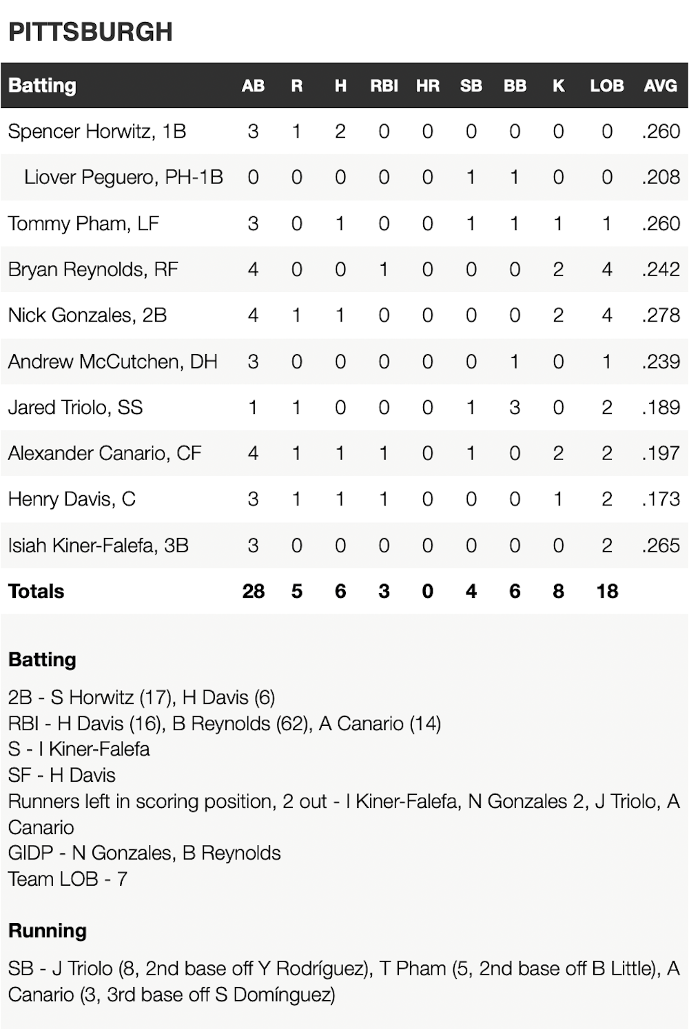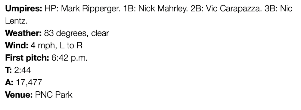 After a seventh-inning leadoff double by Henry Davis, a Brendon Little wild pitch almost hit pinch-hitter Liover Peguero and allowed Davis to score to put the Pirates ahead 3-2. They added two insurance runs in the eighth on an error and a sacrifice fly by Davis.