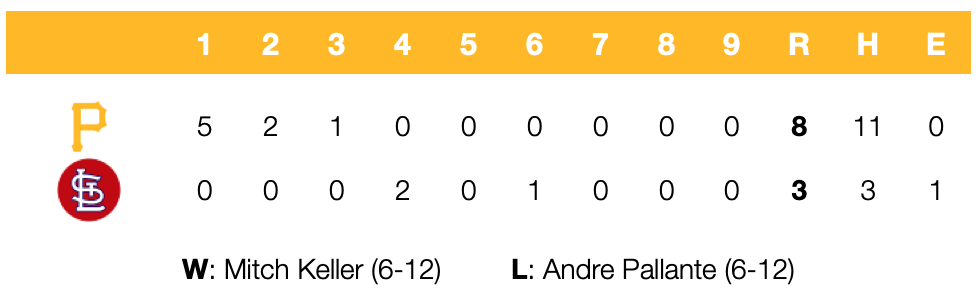 The first six batters to face AndrePallante each reached base and the Pirates produced a five-run first inning en route to providing plenty of support for MitchKeller and company in an 8-3 win tonight at Busch Stadium.