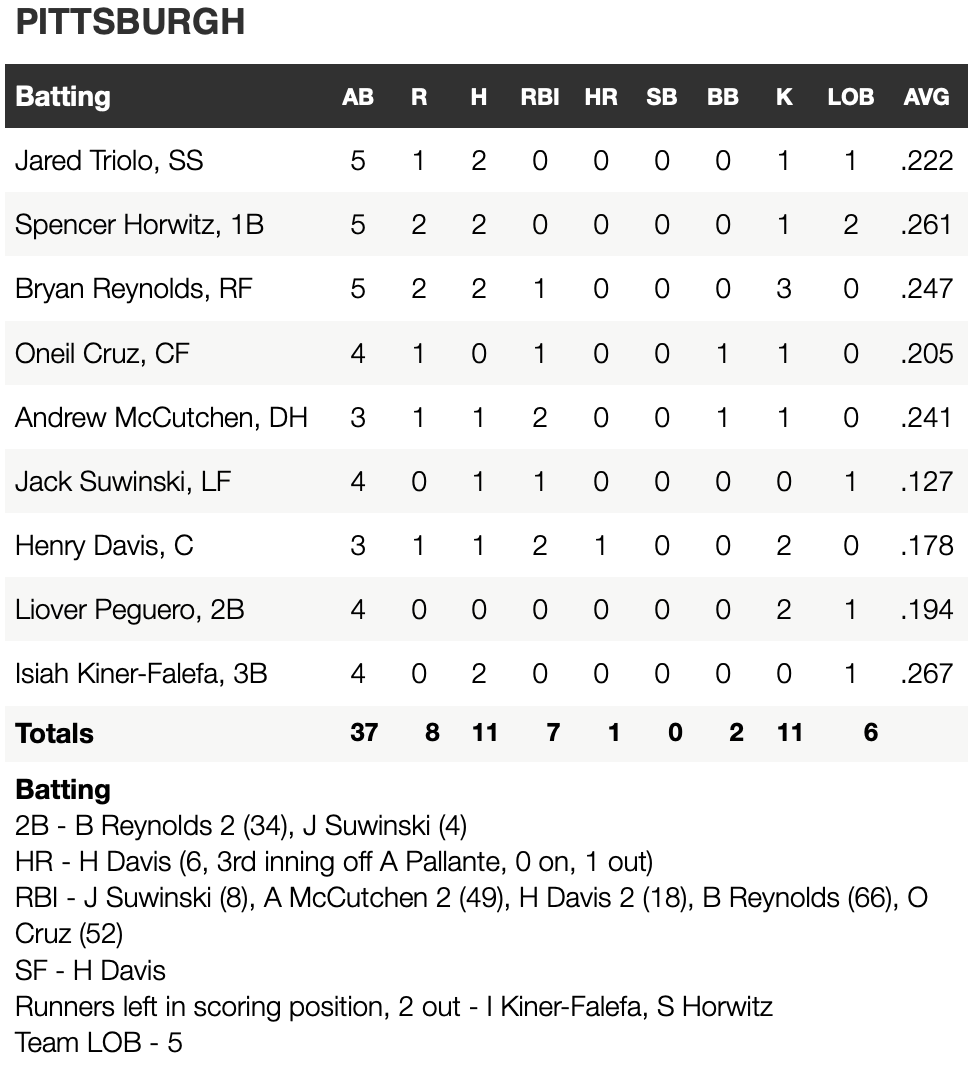 Bryan Reynolds and Jack Suwinski each contributed with an RBI double in the first, while Andrew McCutchen drove in two runs with a single. Henry Davis also drove in a run with a sacrifice fly before homering in the third. Reynolds, SpencerHorwitz, JaredTriolo and IsiahKiner-Falefa each finished with multi-hit efforts to pace the 11-hit attack.