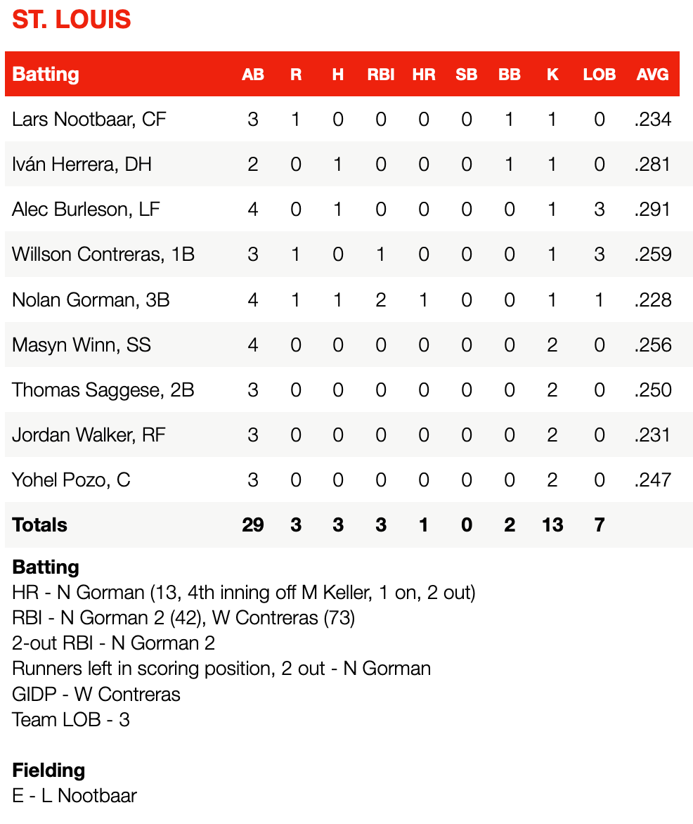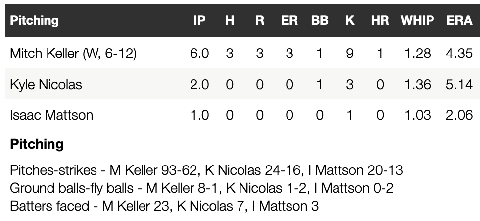 The offense helped complement a strong pitching performance by Keller. He allowed three runs on three hits and a walk while striking out a season-high nine batters over six innings to produce his 16th quality start of the season. Kyle Nicolas covered two scoreless innings out of the bullpen and Isaac Mattson closed out the win in the ninth.