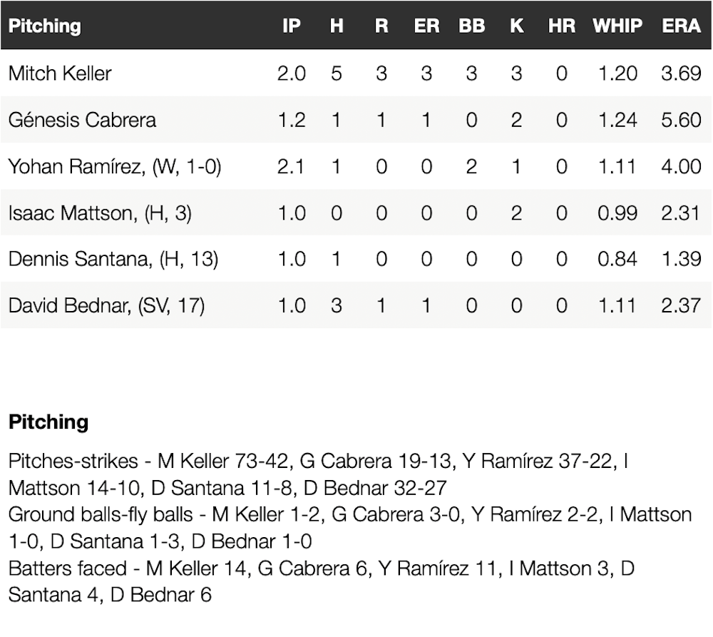 Mitch Keller lasted a season-low two innings, allowing three runs on five hits and three walks. He threw 73 pitches in his shortest outing since Aug. 16, 2022 when he also lasted two innings against the Red Sox. Genesis Cabrera, Yohan Ramirez, Isaac Mattson, Dennis Santana and David Bednar combined to allow two runs over seven innings in relief.
