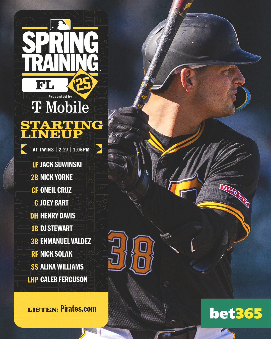 • We get Jack Suwinski in the leadoff spot again, D.J. Stewart become the next candidate to get a start at first base, Oneil Cruz in center and Henry Davis at DH.