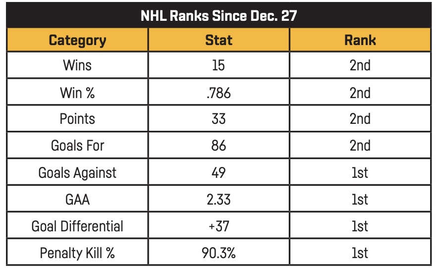 A reader mentioned the other day that we might all be underplaying the Penguins' 15-3-3 surge since Christmas, so here, check out all their top-two categories in that span:
