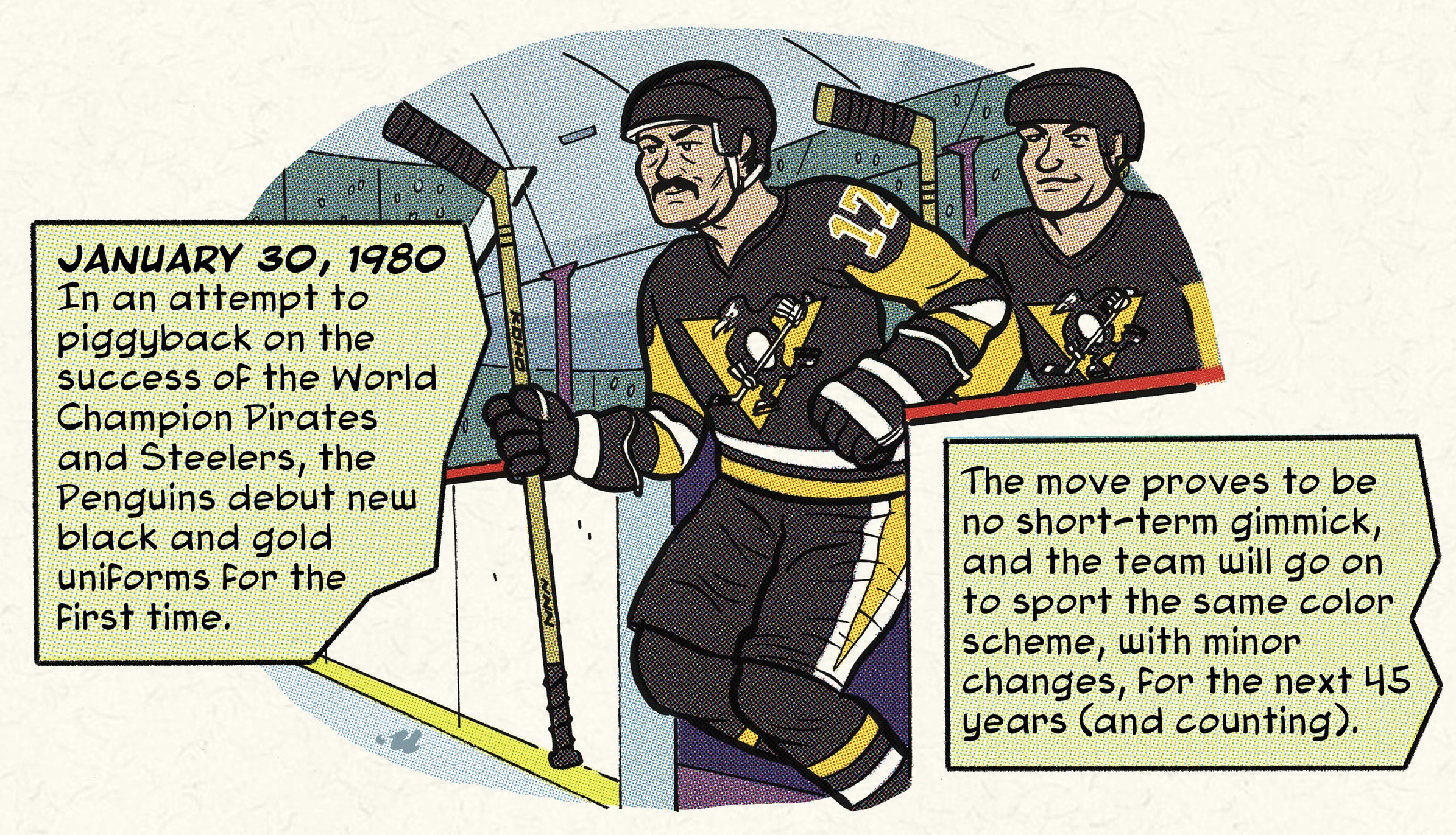 Still is. Fine time to retell that. And today just happens to mark the 46th anniversary of the date the Penguins switched to black and gold to ensure we'd be the only city in North America where all the teams share the same first name, the same colors: