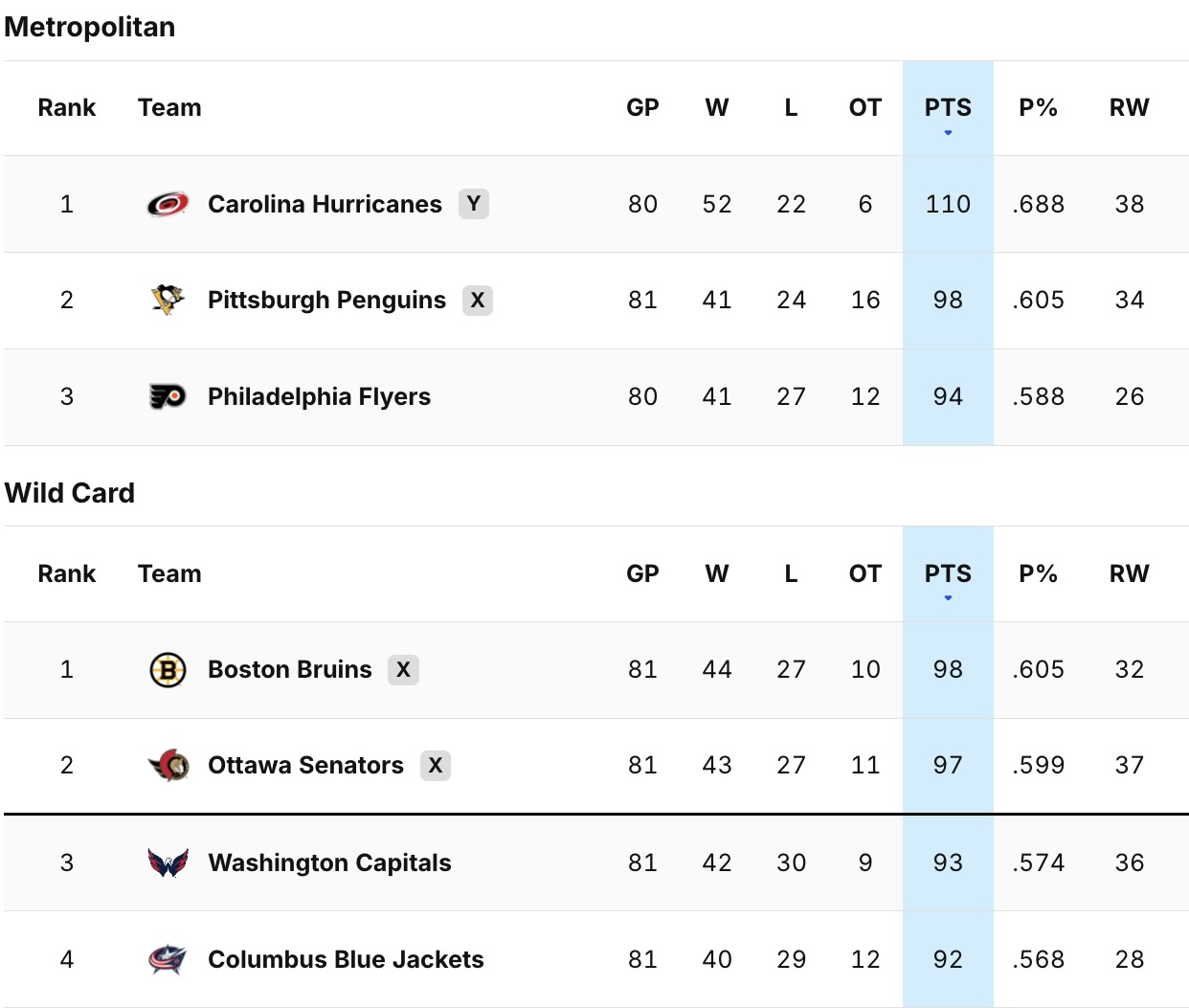 The Blue Jackets lost to the Bruins, 3-2, today in Columbus, Ohio, and the Capitals, of course, beat the Penguins, 3-0, in Washington. But both the Blue Jackets and Capitals face ugly odds if only because they've each got one game left, and it's against each other Tuesday in Columbus. Whereas the Flyers have two games left, both in Philadelphia, Monday against the Hurricanes and Tuesday against the Canadiens. While also weighing that neither Carolina nor Montreal have much motivation to win.