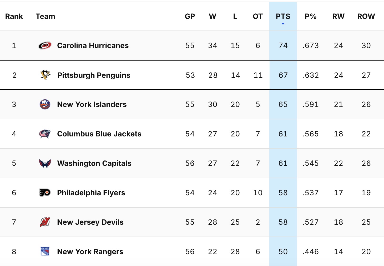 OK, see that six-point gap between the Penguins in second and the Blue Jackets and Capitals, both tied for fourth place? And that the Penguins have games in hand on both?