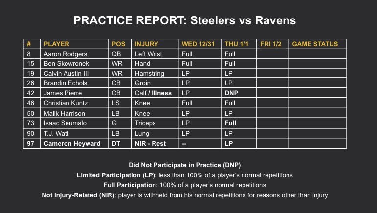 James Pierre (illness) didn’t practice today. Everyone else on the report, including T.J. Watt who was limited, practiced in some fashion. Isaac Seumalo (triceps) was a full participant.