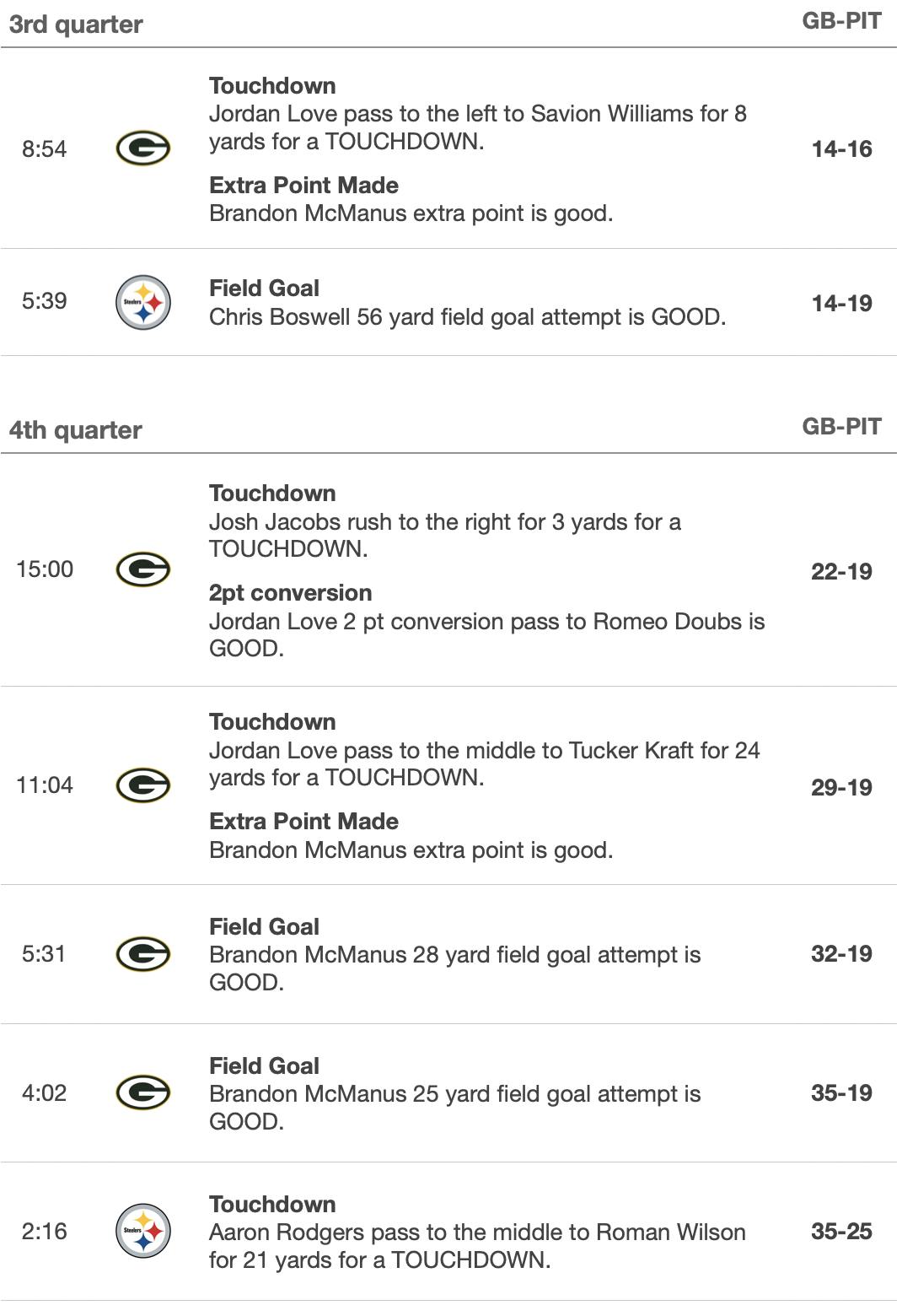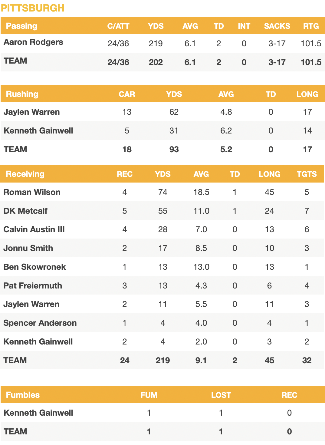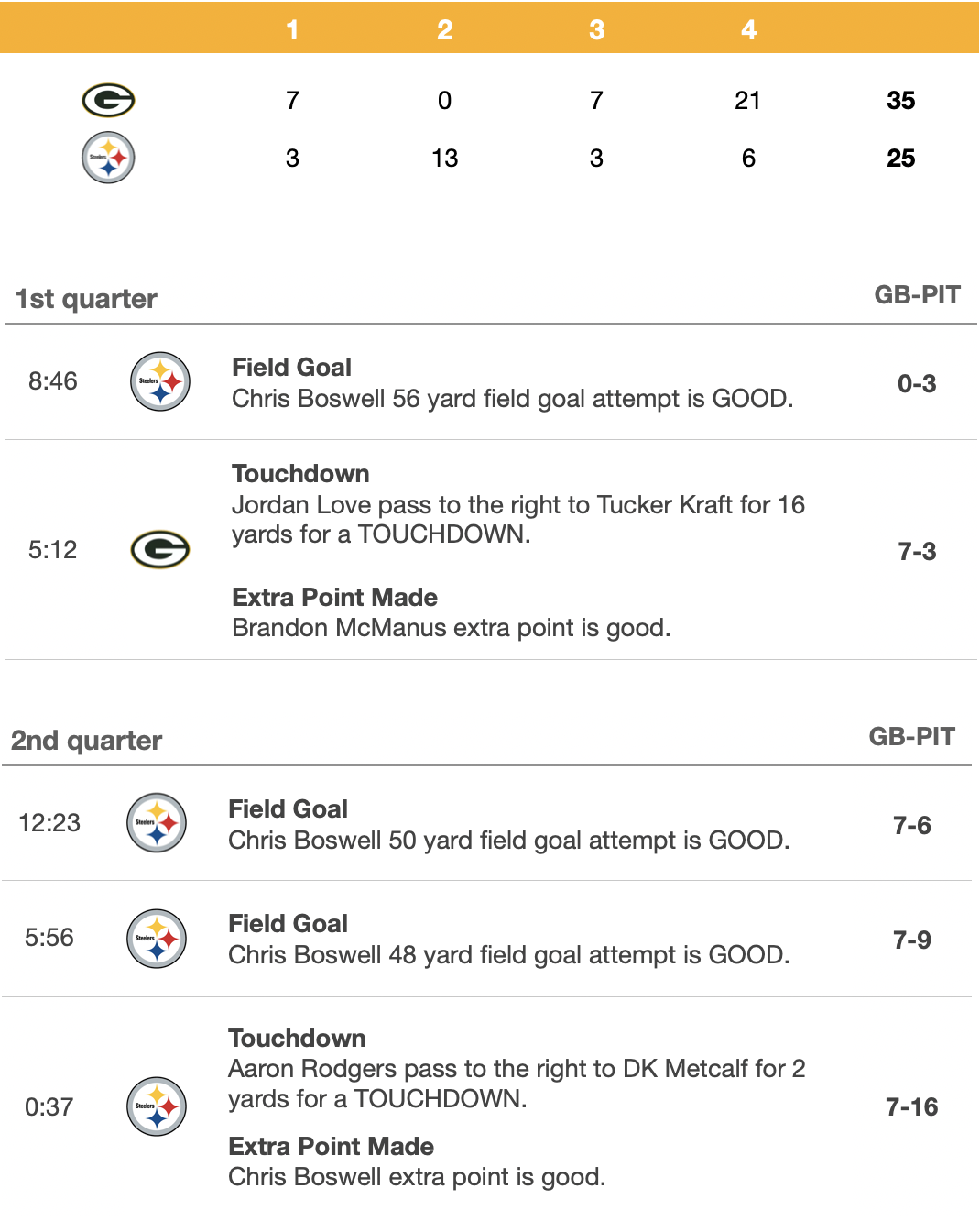 Everything everyone could want related to the Steelers' 35-25 loss to the Packers today at Acrisure Stadium, including all that Chris Halicke and I have from here: