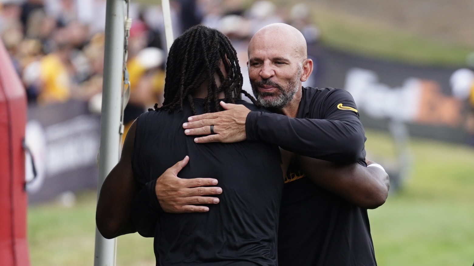 Dallas Mavericks head coach Jason Kidd was also in the house today watching practice. Here he is giving Najee Harris a hug after the Steelers had finished up.