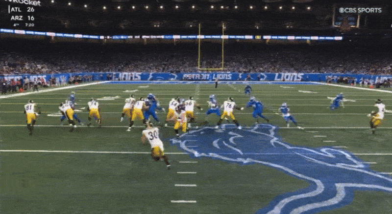 In case you can't quite make out what happens there, Gainwell falls to the ground as Alex Anzalone interferes with him, which was called by the officials, but the ball hit Gainwell's right arm while he was on the ground. Gainwell secured it, got up off the ground without being touched and ran into the end zone.