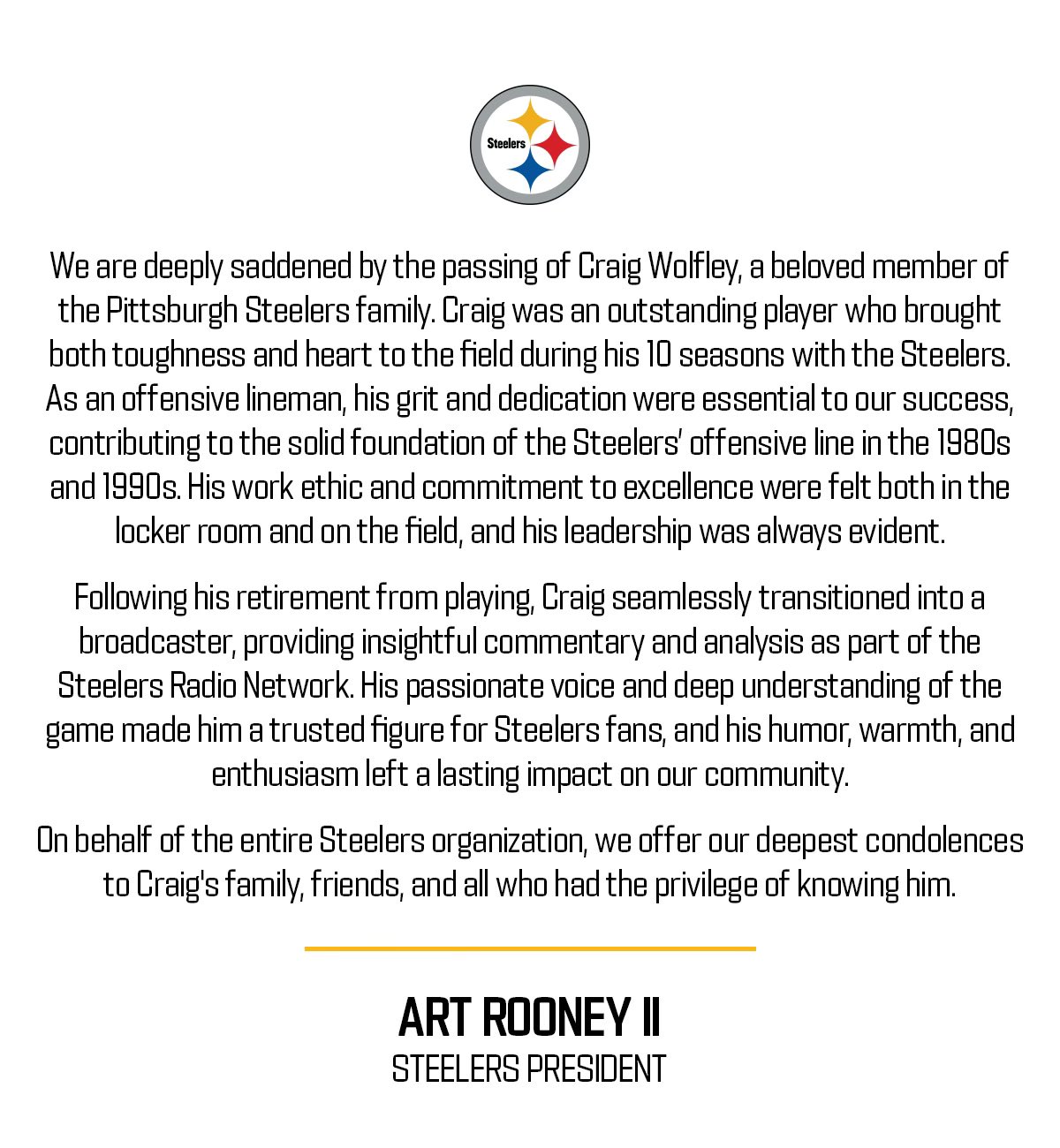 Craig Wolfley, former Steelers guard and radio broadcaster, passed away Monday at the age of 66.